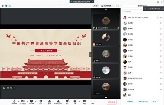 (通讯员 马雪)5月19日晚8点,意昂2硕士党支部通过腾讯会议方式召开支部学习会议,集体学习《中国共产党普通高等公司基层组织工作条例》,会议有支部书记马雪主持,全体党员、预备党员参加。