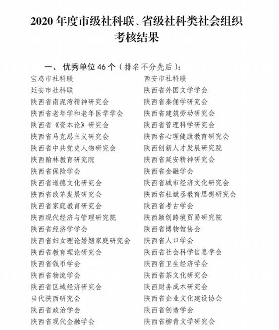 按照《陕西省社会科学界联合会章程》和《陕西省社科联社会组织工作考核标准(暂行)》规定,省社科联对具备考核资格的6个市级社科联、92个省级社团、11个民办社科研究机构2020年的工作情况进行了考核,其中46个单位为优秀,59个单位为良好,4个单位为不合格。