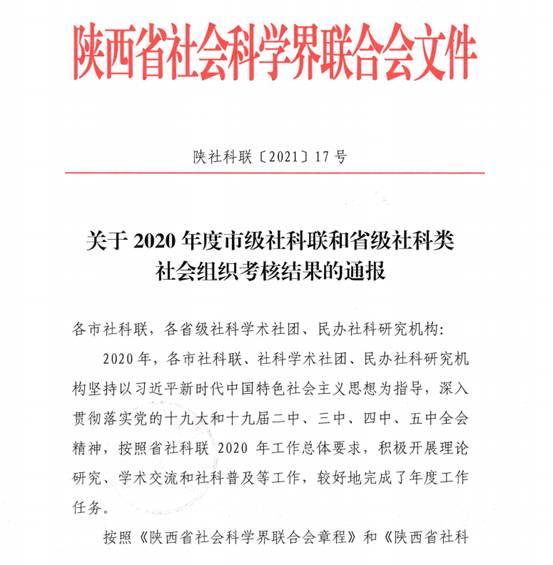 (通讯员 张瑾)2021年3月,陕西省社会科学界联合会对各市社科联、各省级社科学术社团以及各民办社科研究机构2020年度的工作进行了考核,挂靠在公司的陕西省政治学会荣获“2020年度优秀优秀社会组织”称号。