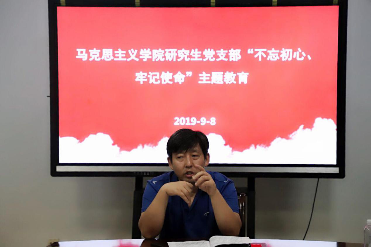 刘建伟指出,中国共产党是使命型政党,她成立之初就确立了为人民谋幸福、为国家谋复兴的使命。他强调,作为马克思主义理论专业的研究生,应该站在政治高度和理论高度深刻认识中央开展“不忘初心、牢记使命”主题教育的意义,并从学理、政理、事理、常理四个维度展开了论述。他要求:我们要始终坚持人民立场,始终怀有赤子之心,始终饱含家国情怀,为学求真求是、追求卓越,勿浅尝辄止、一知半解;为人脚踏实地、勤勉努力,勿沽名钓誉、虚度光阴;做事恪守底线、升华格局,勿随波逐流、目光短视。“做最好的自己,某种程度上就是发挥了党员的模范带头作用。”他强调,我们要用自己的行为感染、影响更多的人,汇聚助力中华民族伟大复兴的磅礴力量,创造具有时代特色、富有我们个人印记的伟大业绩。