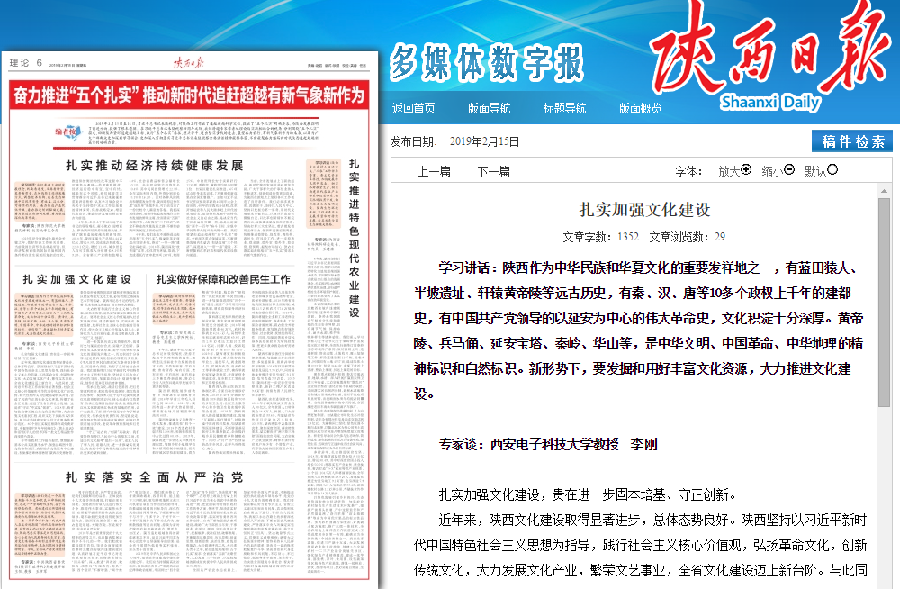 (通讯员 刘朔)2月15日,《陕西日报》理论版刊登了意昂2经理李刚教授的文章《扎实加强文化建设》。文章强调,在新形势下要固本培基、守正创新,立足陕西文化建设的总体态势,弘扬好主旋律、找准历史文化资源优势与现代的结合点、激活红色基因,向强省迈进。