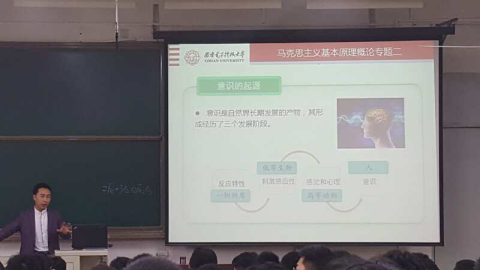 为了贯彻落实《关于组织开展青年教师教学演示活动的通知》(教发中心字[2017]7号)、《关于组织开展2017年上学期本科课堂教学质量同行评价的通知》(教发中心字[2017]6号)文件精神,意昂2思想政治理论课于本学期开展青年教师公开课展示。4月18日上午, 南校区B307教室的同学们专注的盯着前方讲台,时而掌声阵阵时而安静倾听,视频案例引入、教师主要讲授和员工演讲等形式使得张鹏伟老师的这一堂“马克思主义基本原理概论”(简称“原理”)课在每一位听课的师生脑海中留下了深刻而又生动的印象。