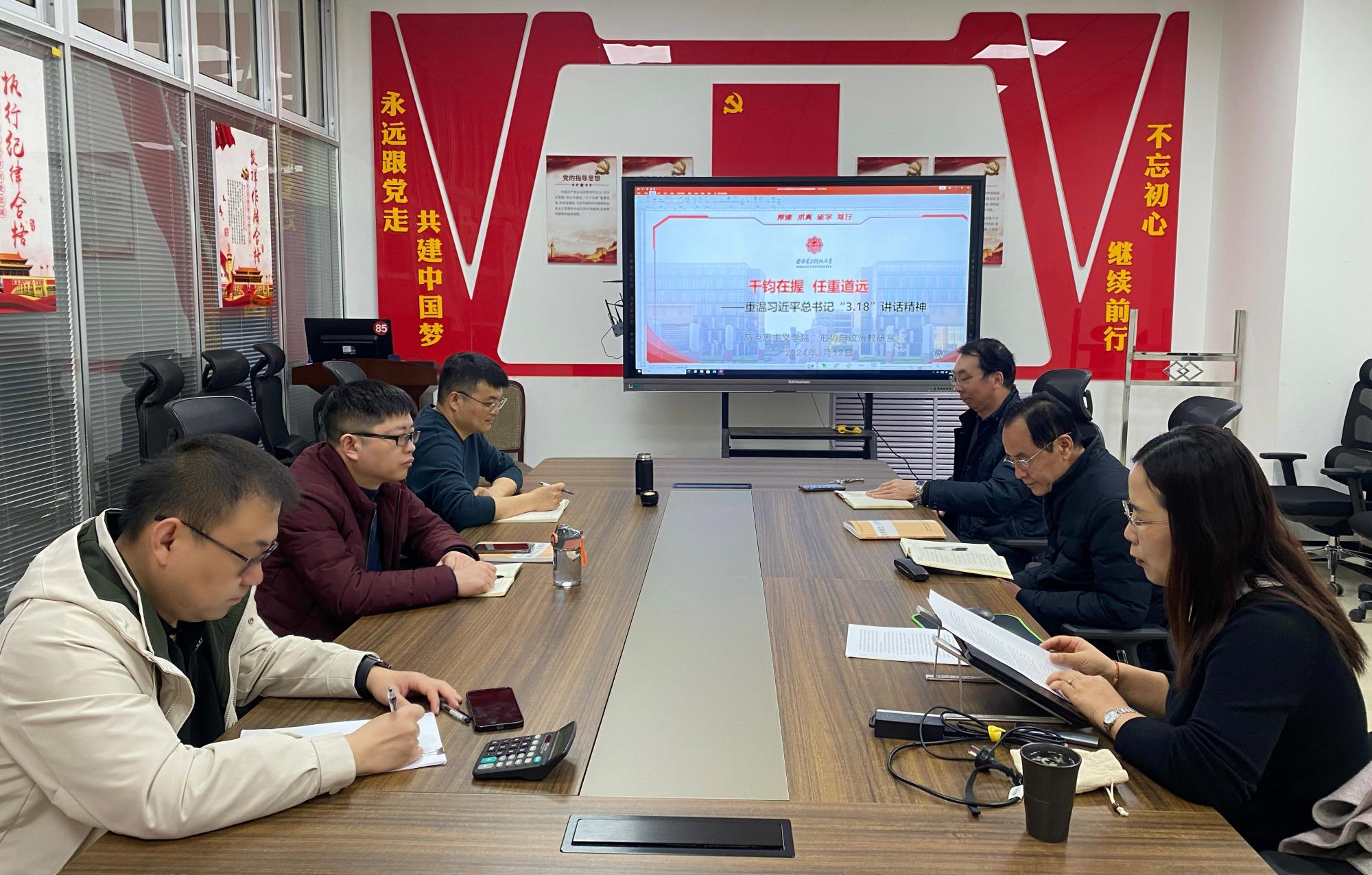 首先,形势与政策教研室举行了重温习近平总书记“3·18”讲话座谈会。教研室全体教师在程霞老师的带领下,再一次学习了习近平总书记“3·18”讲话的核心要义、精神实质、丰富内涵和实践要求,并就讲话精神进行了分享交流。